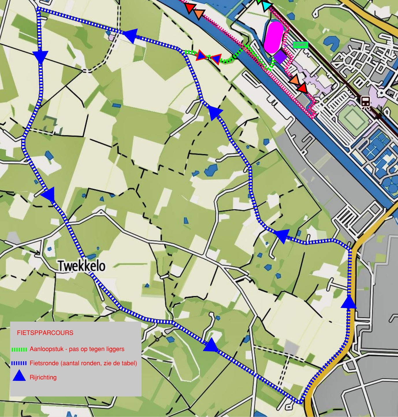 Twekkelo, een prachtig gebied op de grens van Enschede en Hengelo. Vanaf de wisselzone ga je via een heen- en terugroute naar de fietsronde. Zorg dat je weet hoeveel ronden je moet fietsen. Zie de tabel hieronder voor het aantal ronden dat gereden moet worden.